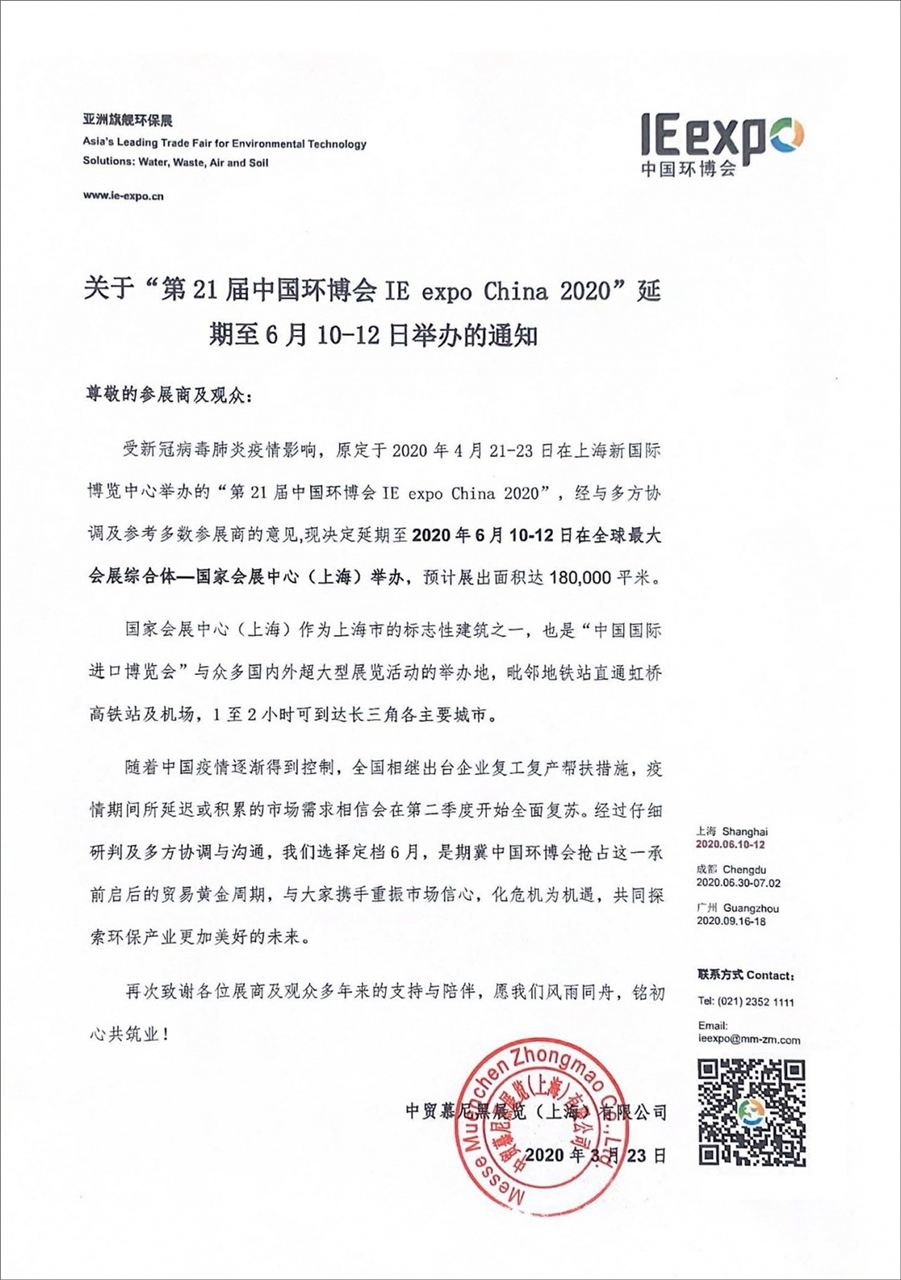 3月23日,中國(guó)環(huán)博會(huì)主辦方宣布,第21屆中國(guó)環(huán)博會(huì)IE expo China 2020延期至2020年6月10-12日移師國(guó)家會(huì)展中心(上海)舉辦,預(yù)計(jì)以18萬平方米的展會(huì)面積,全力為環(huán)保產(chǎn)業(yè)奉獻(xiàn)一場(chǎng)保障安全、富有成效、占得先機(jī)的交流盛會(huì) !