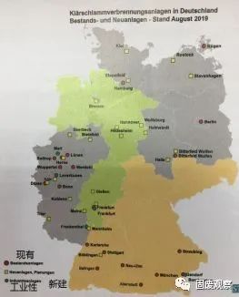 暫存設施建設不是為了污泥的處置,而是為了干化能夠與協(xié)同焚燒實現(xiàn)匹配。暫存設施的生存時間取決于協(xié)同焚燒與獨立焚燒的競爭情況、取決于新建獨立焚燒設施的投產時間和能力。本文作者認為,今后仍然有10%左右的處理后污泥采用土地利用的處置方式,大約每年有17萬t。但是在過渡期后,這一土地利用的量有可能還會減少。圖3是德國現(xiàn)狀和新建設施的地理分布情況。從焚燒設施的地域分布看,各州的能力是不平衡的。