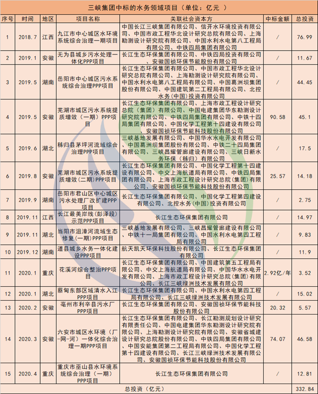 原標(biāo)題:拿下巫山水環(huán)境PPP,三峽中標(biāo)水務(wù)項(xiàng)目總投已逾330億