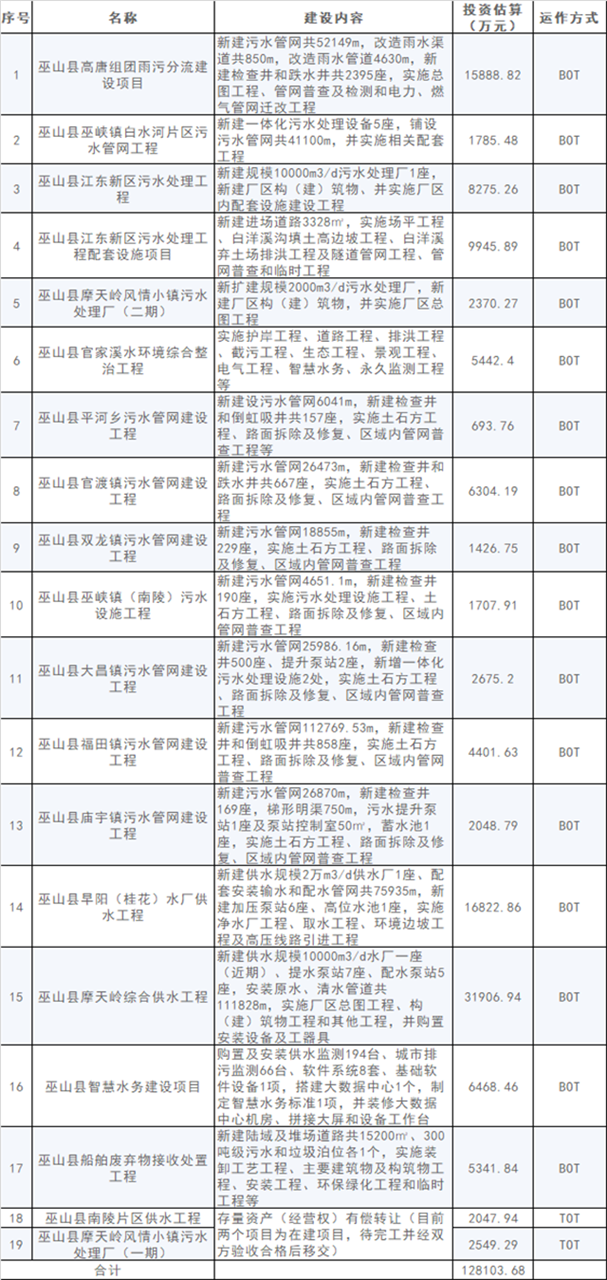 附:重慶市巫山縣水環(huán)境系統(tǒng)綜合治理(一期)PPP項(xiàng)目概況
