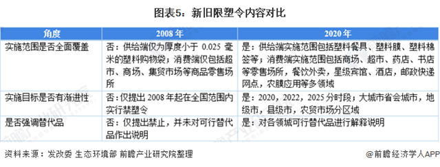 一方面舊版限塑令中僅限制使用厚度小于0.025 毫米的塑料購(gòu)物袋,而在新版限塑令中則除了0.025毫米的塑料購(gòu)物袋被限制外,還包括厚度小于 0.01 毫米的聚乙烯農(nóng)用地膜、一次性發(fā)泡塑料餐具、一次性塑料棉簽、塑料微珠的日化產(chǎn)品,并全面禁止廢塑料進(jìn)口。