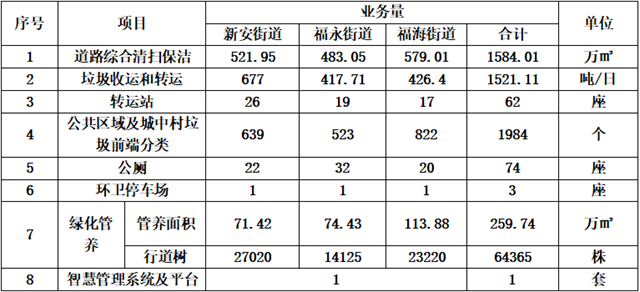 該項(xiàng)目的主要服務(wù)內(nèi)容以常規(guī)環(huán)衛(wèi)工作和服務(wù)業(yè)務(wù)為主,具體包括道路綜合清掃保潔、垃圾收運(yùn)和轉(zhuǎn)運(yùn)、公共區(qū)域及城中村垃圾分類前端設(shè)施維護(hù)、公廁運(yùn)維管理、環(huán)衛(wèi)停車場(chǎng)建設(shè)運(yùn)維管理、智慧管理系統(tǒng)及平臺(tái)建設(shè)運(yùn)維、應(yīng)急保障等多個(gè)方面。具體如下: