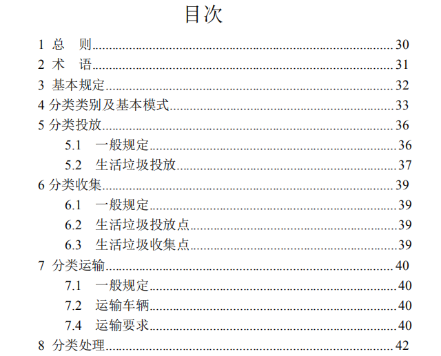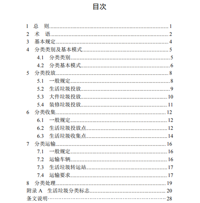 本標(biāo)準(zhǔn)的主要技術(shù)內(nèi)容是:1.總則;2.術(shù)語;3.基本規(guī)定;4.分類類別及基本模式;5.分類投放;6.分類收集;7.分類運輸;8.分類處理。