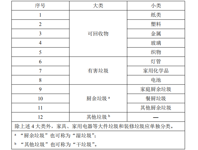 4.1.2 確定了分類類別,一方面可用于指導(dǎo)垃圾源頭分類,另一方面可用于指導(dǎo)企業(yè)參與分類收集運營。根據(jù)《生活垃圾分類標(biāo)志》GB/T19095,生活垃圾分為 4 個大類和 11 個小類。4 個大類分別為可回收物、有害垃圾、廚余垃圾和其他垃圾。其中可回收物又分為紙類、塑料、金屬、玻璃、織物 5 個小類,有害垃圾又分為燈管、家用化學(xué)品、電池 3 個小類,廚余垃圾又分為家庭廚余垃圾、餐廚垃圾、其他廚余垃圾 3 個小類,其他垃圾不分小類。