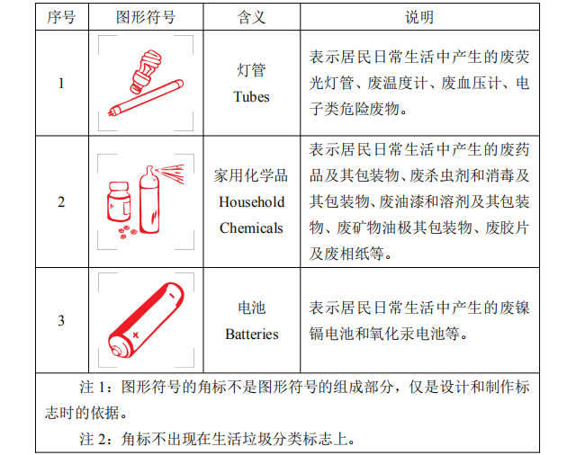 2 有害垃圾:表示《國家危險廢物名錄》中的家庭源危險廢物,包括燈管、家用化學(xué)品和電池等。