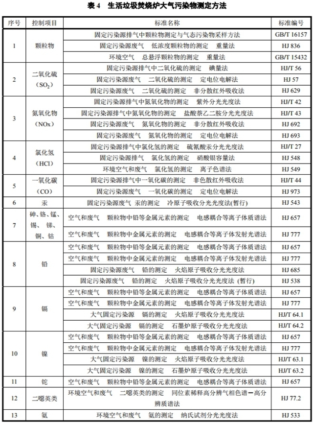 9.10 焚燒爐大氣污染物的測(cè)定方法采用表4所列的方法標(biāo)準(zhǔn)。本標(biāo)準(zhǔn)實(shí)施后國(guó)家發(fā)布的污染物監(jiān)測(cè)方法標(biāo)準(zhǔn),如適用性滿足要求,同樣適用于本標(biāo)準(zhǔn)相應(yīng)污染物的測(cè)定。