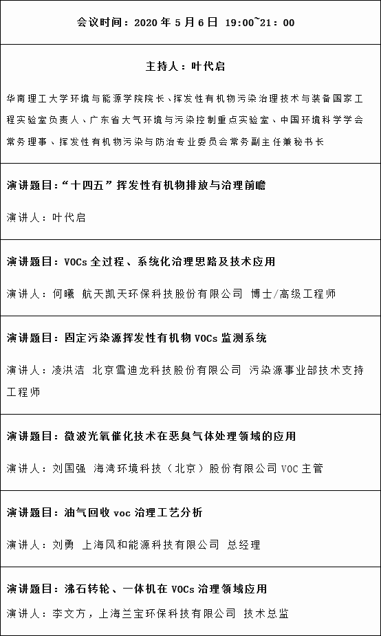 會議將于5月6日18時~21時在環(huán)保在線HB直播平臺舉行,由華南理工大學環(huán)境與能源學院院長/揮發(fā)性有機物污染治理技術與裝備國家工程實驗室負責人葉代啟主持。
