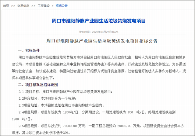 環(huán)保在線從河南省電子招標(biāo)投標(biāo)公共服務(wù)平臺獲悉,目前周口市淮陽靜脈產(chǎn)業(yè)園生活垃圾焚燒發(fā)電項目面向社會公開招標(biāo),該項目已經(jīng)周口市淮陽區(qū)人民政府批準(zhǔn),招標(biāo)人為周口市淮陽區(qū)住房和城鄉(xiāng)建設(shè)局。
