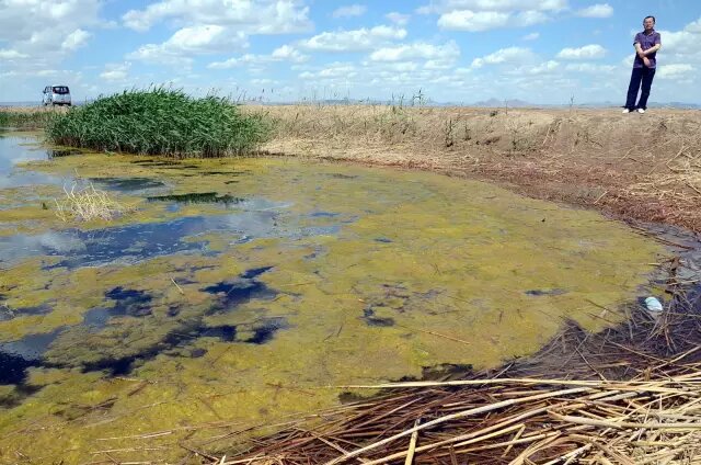 圖為《第一財(cái)經(jīng)日?qǐng)?bào)》記者曾經(jīng)拍攝到的內(nèi)蒙古烏梁素海污染景象:水面大量黃苔滋生,意味著水體已受到嚴(yán)重污染。攝影/章軻