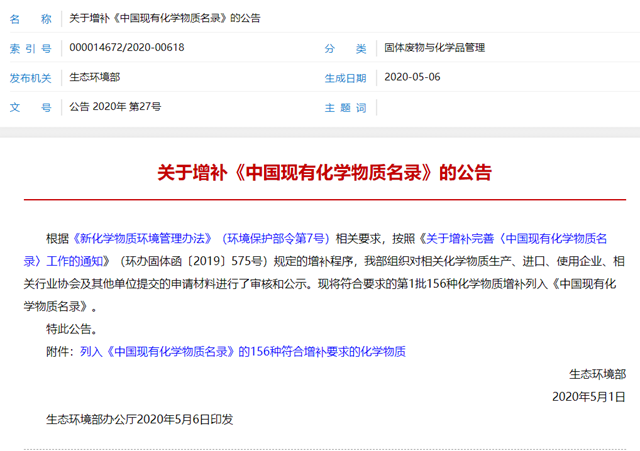 生態(tài)環(huán)境部于5月6日發(fā)布關(guān)于增補《中國現(xiàn)有化學物質(zhì)名錄》的公告,將符合要求的第1批156種化學物質(zhì)增補列入《中國現(xiàn)有化學物質(zhì)名錄》。詳情如下: