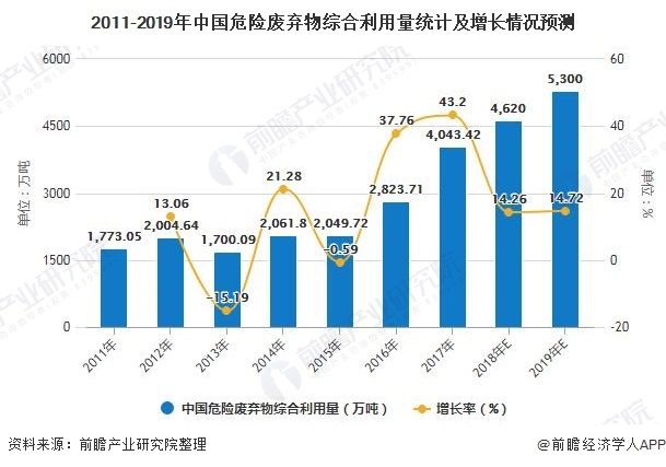 2019-2020年,清廢行動(dòng)逐漸向全國(guó)擴(kuò)散,有利于推動(dòng)危廢處理行業(yè)市場(chǎng)擴(kuò)大,前瞻初步估計(jì)我國(guó)危險(xiǎn)廢棄物綜合利用量為5300萬(wàn)噸,預(yù)計(jì)2020年,我國(guó)危廢綜合利用量將呈現(xiàn)快速增長(zhǎng)。