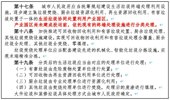 在分類垃圾末端處置措施上,規(guī)定明確鼓勵(lì)具有集約化優(yōu)勢(shì)的固廢產(chǎn)業(yè)園模式,充分利用協(xié)同優(yōu)勢(shì),降低收運(yùn)及處理成本,在實(shí)現(xiàn)環(huán)境效益的同時(shí)強(qiáng)調(diào)經(jīng)濟(jì)效益并重。將一個(gè)城市的終端的處理設(shè)施集中,形成靜脈循環(huán),可以發(fā)揮協(xié)同效應(yīng)、更好地節(jié)約資源,實(shí)現(xiàn)資源、能源共享,提高集約化、智能化水平,推動(dòng)產(chǎn)業(yè)轉(zhuǎn)型升級(jí)。