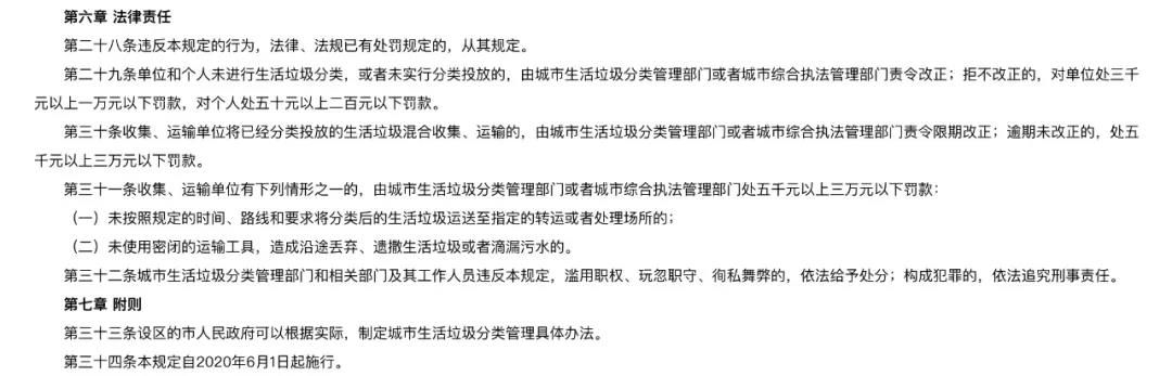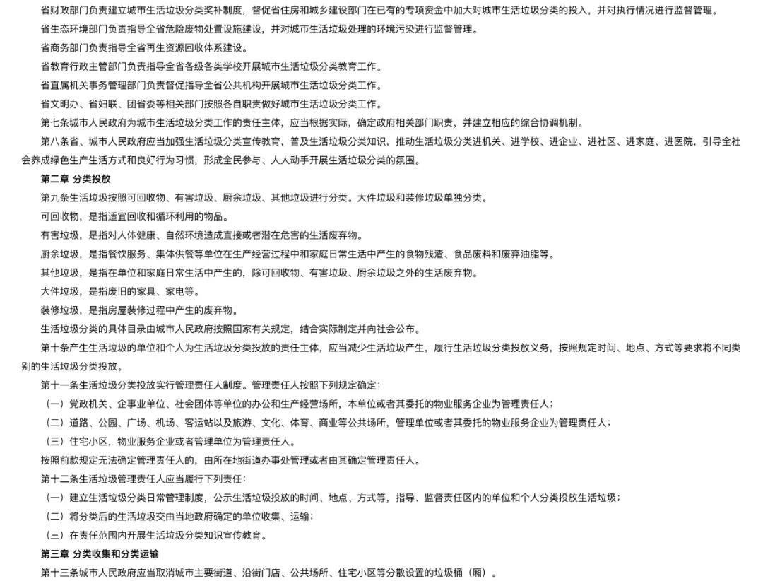 垃圾分類涉及的固體廢棄物種類多、參與主體多、全流程環(huán)節(jié)多,過(guò)去多次垃圾分類嘗試的失敗,均與主管機(jī)構(gòu)責(zé)權(quán)不清、管理邊界模糊,政府的主體監(jiān)管責(zé)任落實(shí)不到位有一定關(guān)系。此次山西省在生活垃圾分類管理規(guī)定中,開(kāi)篇明確了監(jiān)督管理、規(guī)劃設(shè)計(jì)、收費(fèi)機(jī)制、獎(jiǎng)補(bǔ)經(jīng)費(fèi)、各類垃圾處置主管單位及宣傳教育的直接責(zé)任單位,將單中心的管理模式通過(guò)清晰的分工加以細(xì)化,使得省級(jí)文件在落實(shí)過(guò)程中更具可操作性。