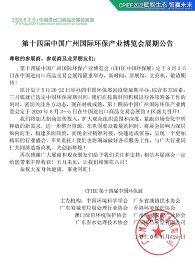 久有凌云志,攜手共前行!我們很榮幸能與廣大行業(yè)同仁共同締造新商機、共創(chuàng)新輝煌!中國環(huán)保展順勢而動,應勢而為,現(xiàn)大展格局,成長興之態(tài);以“賦能生態(tài),智贏未來”為主題,聯(lián)結綠水青山,構建生態(tài)環(huán)保圈,為建設美麗中國而努力奮斗!5月未見8月聚,老地方、大市場、新商機,8月3日—5日,聚焦廣州,第十四屆中國環(huán)保展值得期待!