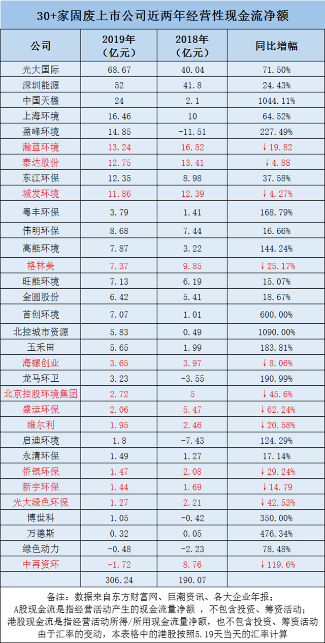 據(jù)統(tǒng)計,32家固廢上市企業(yè),2019年經營活動產生的現(xiàn)金流累計306.24億元,比2018年的190.07億元,高出116億元。