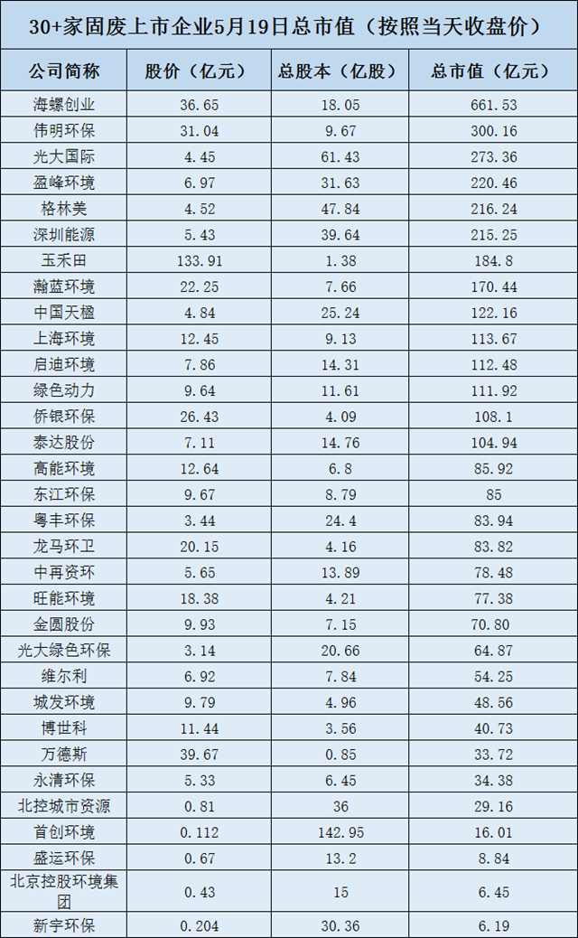 按照5月19日收盤股價,《環(huán)保圈》統(tǒng)計了30+固廢上市企業(yè)總市值(如圖十所示),海螺創(chuàng)業(yè)、偉明環(huán)保、光大國際市值位居行業(yè)前三,海螺創(chuàng)業(yè)總市值比光大國際+偉明環(huán)保,兩家總市值累計總和,還要高出88億元。