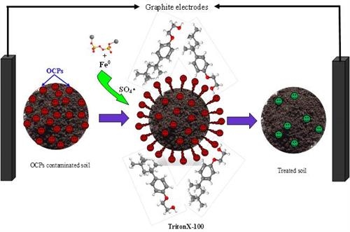 研究發(fā)現(xiàn)1:利用曲拉通X-100(TX--100)在電動條件下增加OCs的有效性,提高土壤中OCs的氧化效率。選取共溶劑TX-100和Na2S2O8為電解液,OCs的去除率在56.36%和88.05%之間。TX-100能夠顯著提高與土壤顆粒緊密結(jié)合的難溶性化合物的溶解度,同時電動修復裝置促進土壤中氧化劑和表面活性劑的遷移,促使共溶劑在土壤中傳輸和擴散,該設(shè)置能夠促進土壤中難溶性化合物和氧化劑的有效接觸,同時TX-100通過溶出土壤中金屬離子促進S2O82-活化產(chǎn)生硫酸鹽自由基和羥基自由基,從而提高土壤中OCs的降解效率。