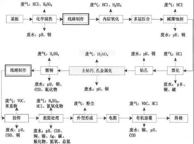 覆銅板生產(chǎn)工藝屬于無水工藝,除冷卻水、檢驗檢測部門會產(chǎn)生少量污水外,其他生產(chǎn)流程不會產(chǎn)生污水。生產(chǎn)過程產(chǎn)生的污染物主要在廢氣方面,較多來自于使用丙酮、甲苯等有機溶劑的揮發(fā)。