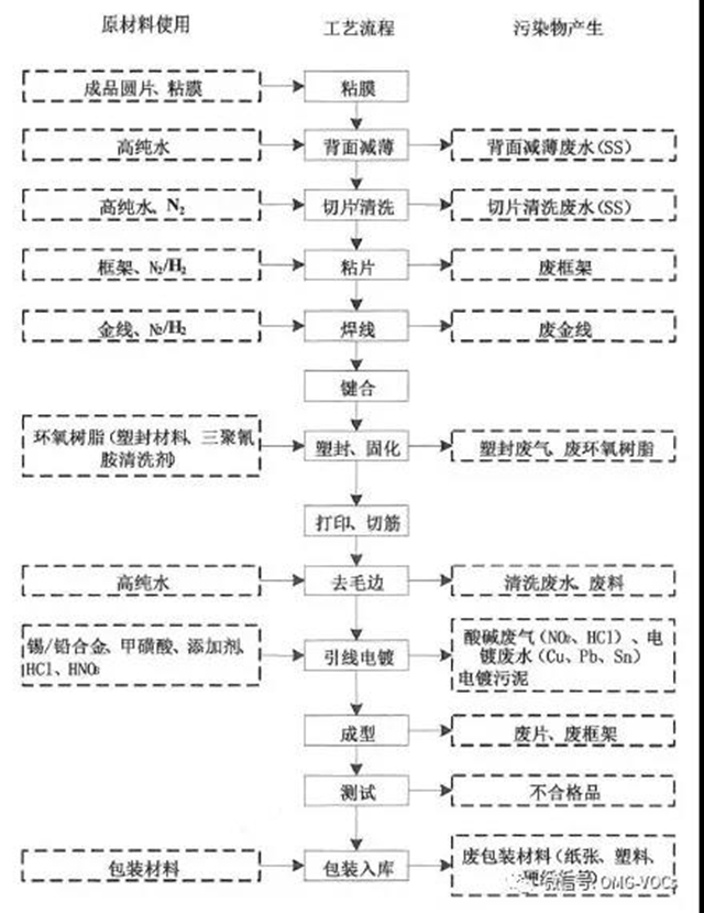 封裝工藝產(chǎn)生的廢氣較為簡單,主要是酸性氣體、環(huán)氧樹脂及粉塵。酸性廢氣主要產(chǎn)生于電鍍等工藝;烘烤廢氣則產(chǎn)生于晶粒粘貼、封膠后烘烤過程;劃片機在晶片切割過程中,產(chǎn)生含微量砂塵的廢氣。