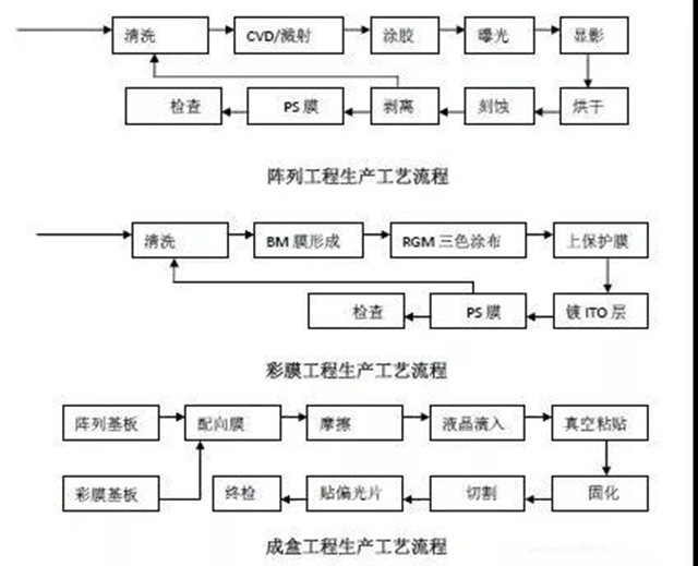 完整的TFT-LCD 生產(chǎn)工藝流程主要包括陣列工程( Array) 、彩膜工程(CF) 、成盒工程(Cell ) 三大部分。