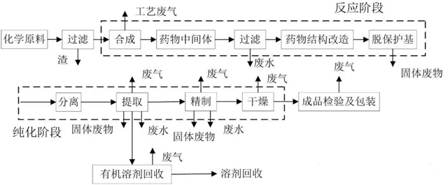 化學合成工序主要大氣污染物包括顆粒物、氯化氫和氨等無機物,以及化學合成使用的有機原料和有機溶劑,如苯、甲苯、氯苯、氯仿、丙酮、苯胺、二甲基亞砜、乙醇、甲醇、甲醛等。