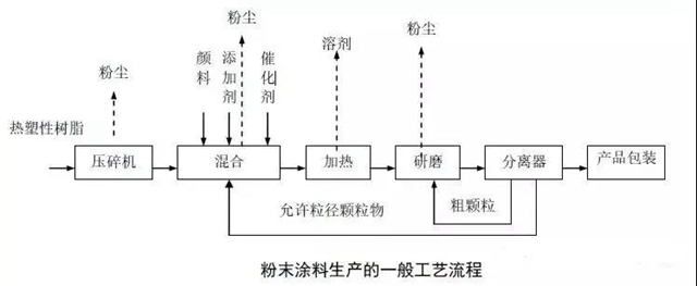 粉末涂料通常是由聚合物、顏料、助劑等混合粉碎加工而成。粉末涂料的制備方法大致可分為干法和濕法兩種方法,干法涂料生產(chǎn)主要是熔融混合法;濕法工藝有蒸發(fā)法、噴霧干燥法和沉淀法。蒸發(fā)法是先配置溶劑型涂料、然后用薄膜蒸發(fā)、真空蒸餾等法除去溶劑得到固體涂料,然后經(jīng)過粉粹、過篩分級得到粉末涂料,主要是丙烯酸樹脂基粉末涂料生產(chǎn),使用較多的是薄膜蒸發(fā)器和行星螺桿擠出機;噴霧干燥法則是先配置溶劑型涂料,經(jīng)過研磨、調(diào)色,然后分別噴霧干燥造粒或者在液體沉淀造粒得到粉末涂料。