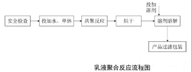 水基膠黏劑的生產(chǎn)工藝通常是采用乳液聚合法生成,即以水作為外相,單體在乳化劑或者表面活性劑和充分攪拌的情況,通過膠束分散于水相并發(fā)生增溶溶解。通過添加水溶性引發(fā)劑(如過硫酸鉀等)后,一經(jīng)加熱,引發(fā)劑就開始分解并產(chǎn)生自由基,進而引發(fā)膠束中單體發(fā)生聚合或者共聚反應。