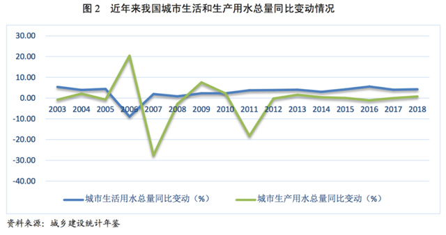 從具體子行業(yè)來(lái)看,除2006年居民生活用水有所波動(dòng)外[3],其他年份居民生活用水總量增速保持穩(wěn)定,生產(chǎn)用水在2012年之前波動(dòng)較大,之后年度增速變動(dòng)與生活用水趨同。從具體波動(dòng)來(lái)看,生產(chǎn)用水波動(dòng)與我國(guó)水務(wù)政策密切相關(guān),2006年,我國(guó)在《十一五規(guī)劃綱要》中首次提出“節(jié)能減排”使得我國(guó)生產(chǎn)用水量同比下降,加之經(jīng)濟(jì)危機(jī)因素影響,生產(chǎn)用水量在2007年和2008年同比增速為負(fù),之后隨著經(jīng)濟(jì)發(fā)展用水量同比增速又有所回升。2011年,十二五規(guī)劃出臺(tái)《“十二五”節(jié)能減排綜合性工作方案》,使得用水總量同比增速呈現(xiàn)大幅下降,但政策之后保持相對(duì)穩(wěn)定。根據(jù)《國(guó)家節(jié)水行動(dòng)方案》要求,到2022年,萬(wàn)元國(guó)內(nèi)生產(chǎn)總值和工業(yè)增加值用水量較2015年分別降低30%和28%,預(yù)期我國(guó)生產(chǎn)用水效率將有所增長(zhǎng),進(jìn)而對(duì)沖因經(jīng)濟(jì)總量的持續(xù)增長(zhǎng)對(duì)生產(chǎn)用水總量需求的增加,工業(yè)生產(chǎn)整體用水總量預(yù)期保持穩(wěn)定。