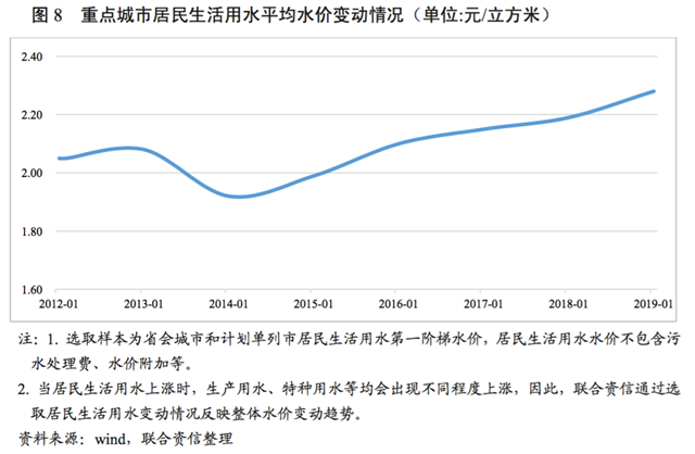 2019年,我國(guó)重點(diǎn)城市居民生活用水平均水價(jià)為2.28元/立方米,較2018年增加0.09元/立方米,居民生活用水水價(jià)整體呈現(xiàn)小幅上漲趨勢(shì)。