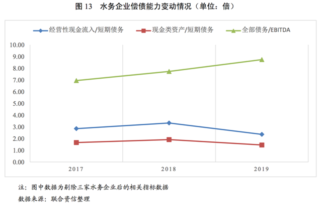 長(zhǎng)期償債能力方面,2017—2019年,受水務(wù)投資需求增加、盈利水平增速相對(duì)緩慢影響,水務(wù)企業(yè)全部債務(wù)/EBITDA持續(xù)增長(zhǎng),分別為6.95倍、7.73倍和8.74倍,但整體長(zhǎng)期償債能力仍然較強(qiáng),預(yù)計(jì)未來(lái)行業(yè)償債能力將繼續(xù)保持穩(wěn)定。因存量債務(wù)規(guī)模過(guò)大或盈利能力下滑導(dǎo)致的償債指標(biāo)明顯弱化的企業(yè)應(yīng)重點(diǎn)關(guān)注。同時(shí),考慮到水務(wù)企業(yè)和區(qū)域內(nèi)城投企業(yè)可能通過(guò)往來(lái)款形式進(jìn)行資金拆借,水務(wù)企業(yè)部分融資并非用于自身經(jīng)營(yíng),從而加劇了水務(wù)企業(yè)的債務(wù)負(fù)擔(dān)。