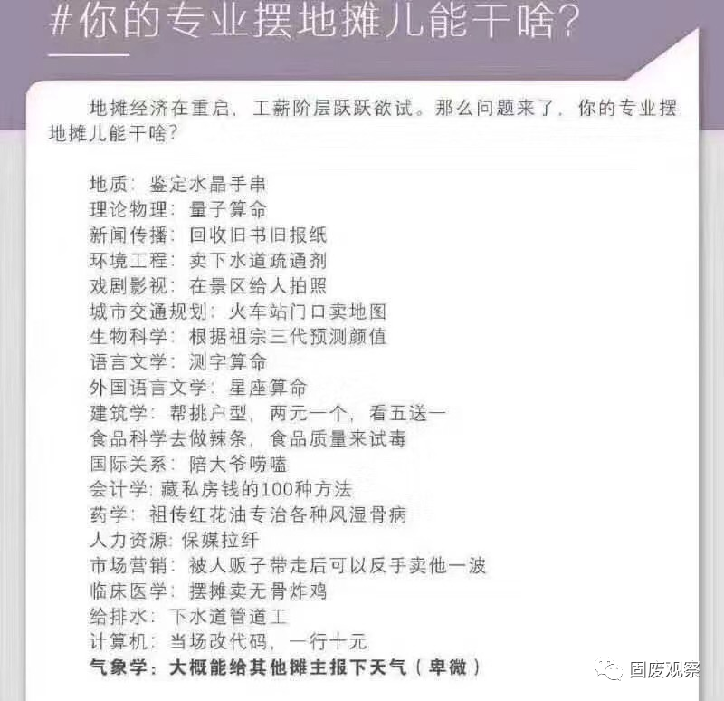 有沒有被 “擺地?cái)偂?/span> 刷屏?“2020最新風(fēng)口——擺地?cái)偅?/span>全民討論的最佳創(chuàng)業(yè)機(jī)會——擺地?cái)偂?/span>一夜之間,地?cái)偨?jīng)濟(jì)火了今年政府工作報告提出:通過穩(wěn)就業(yè)促增收保民生,提高居民消費(fèi)意愿和能力。支持餐飲、商場、文化、旅游、家政等生活服務(wù)業(yè)恢復(fù)發(fā)展。據(jù)了解,中央文明辦主動適應(yīng)常態(tài)化疫情防控形勢,在今年全國文明城市測評指標(biāo)中,已明確要求不將占道經(jīng)營、馬路市場、流動商販列為文明城市測評考核內(nèi)容,推動文明城市創(chuàng)建在恢復(fù)經(jīng)濟(jì)社會秩序、滿足群眾生活需要的過程中發(fā)揮更加積極作用。地?cái)偨?jīng)濟(jì)、小店經(jīng)濟(jì)是就業(yè)崗位的重要來源