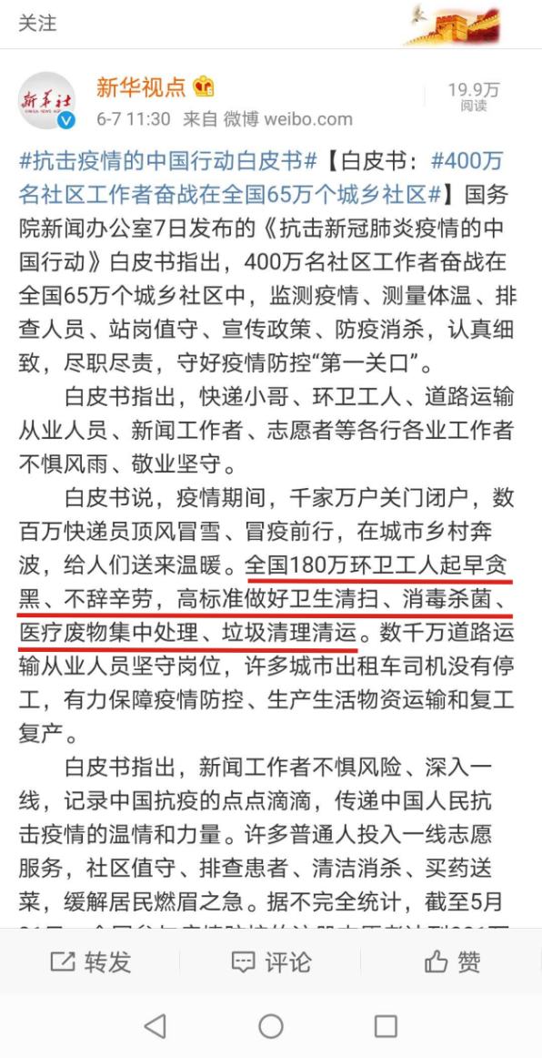 國(guó)務(wù)院新聞辦公室7日發(fā)布《抗擊新冠肺炎疫情的中國(guó)行動(dòng)》白皮書。白皮書充分肯定了疫情期間180萬環(huán)衛(wèi)工人所付出的努力。