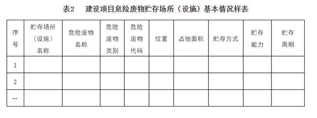 環(huán)境影響報告書(表)應列表明確危險廢物貯存場所(設施)的名稱、位置、占地面積、貯存方式、貯存容積、貯存周期等,樣表見表2。