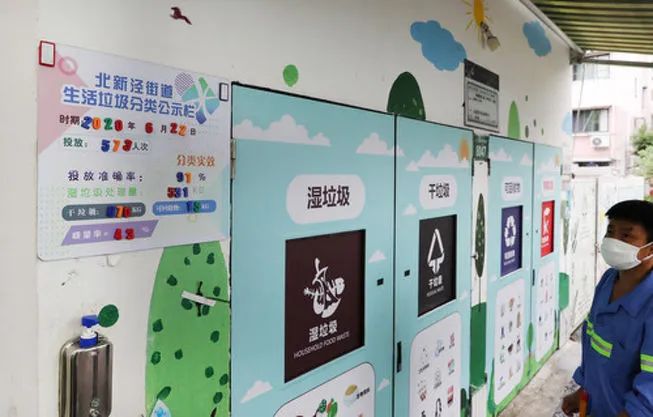 在上海長(zhǎng)寧區(qū)新涇六村小區(qū)垃圾分類投放點(diǎn),公示欄上顯示前一天的垃圾分類情況數(shù)據(jù)(6月23日攝)。新華社記者 方喆 攝