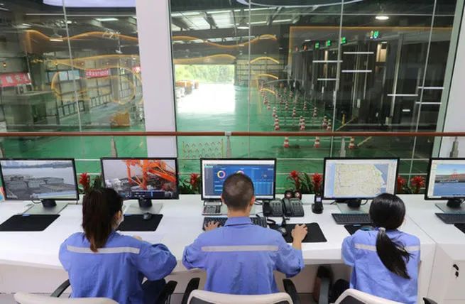 工作人員在上海城投環(huán)境集團(tuán)徐浦基地內(nèi)的卸料大廳中央控制室內(nèi)工作(6月22日攝)。新華社記者 方喆 攝