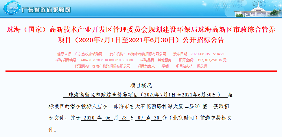按照開(kāi)標(biāo)計(jì)劃,6月28日,采購(gòu)預(yù)算高達(dá)357,303,258.36元/年的珠海高新區(qū)市政綜合管養(yǎng)項(xiàng)目將公布中標(biāo)結(jié)果。