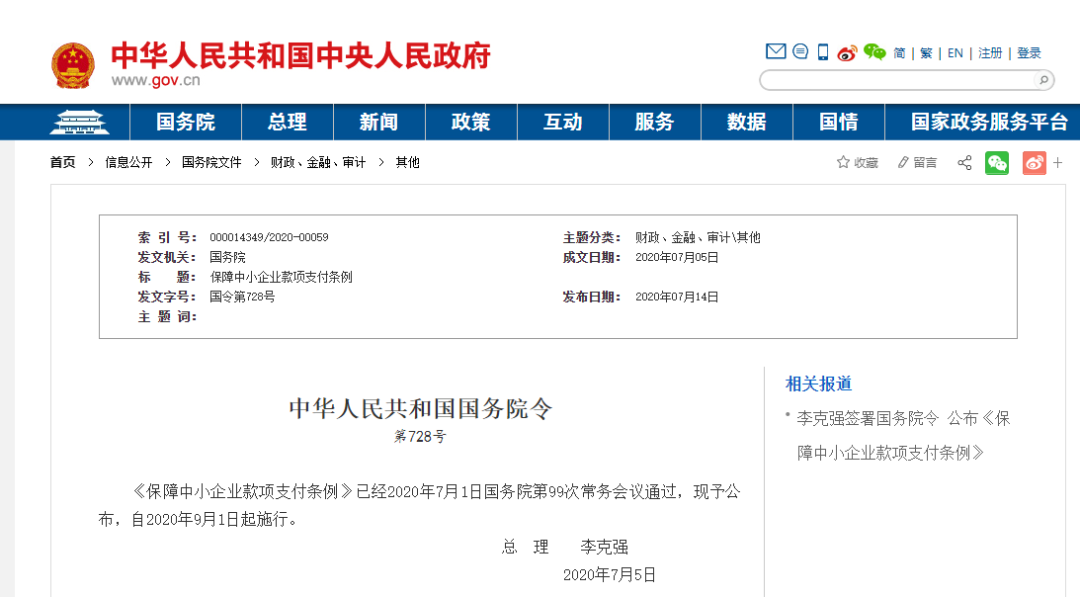 《保障中小企業(yè)款項支付條例》已經(jīng)2020年7月1日國務(wù)院第99次常務(wù)會議通過,現(xiàn)予公布,自2020年9月1日起施行。