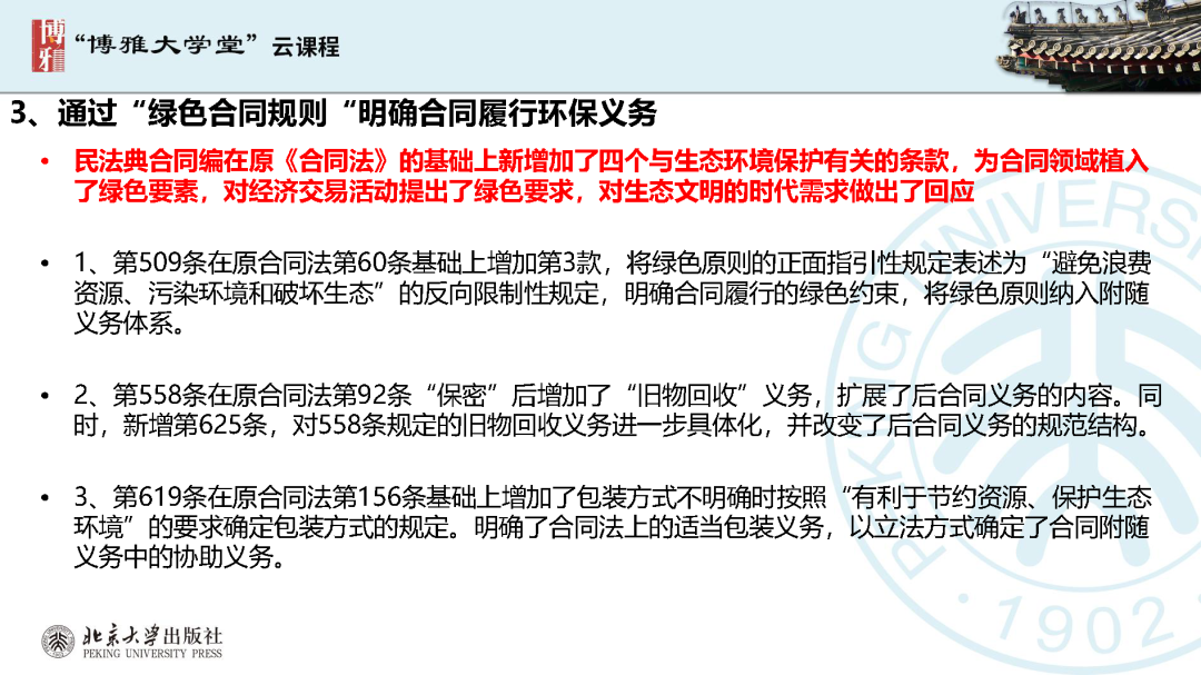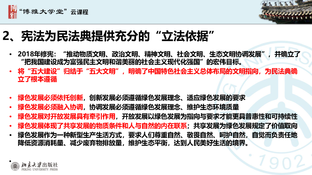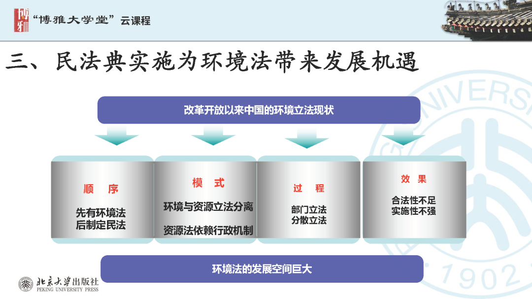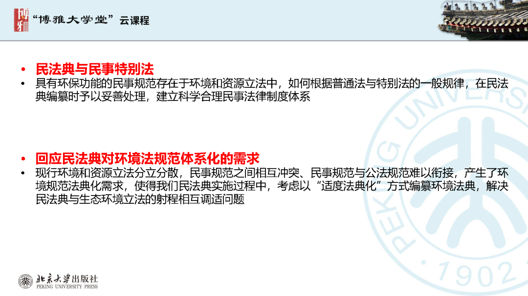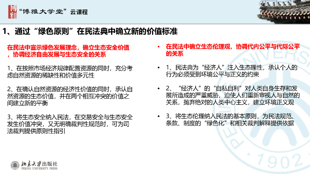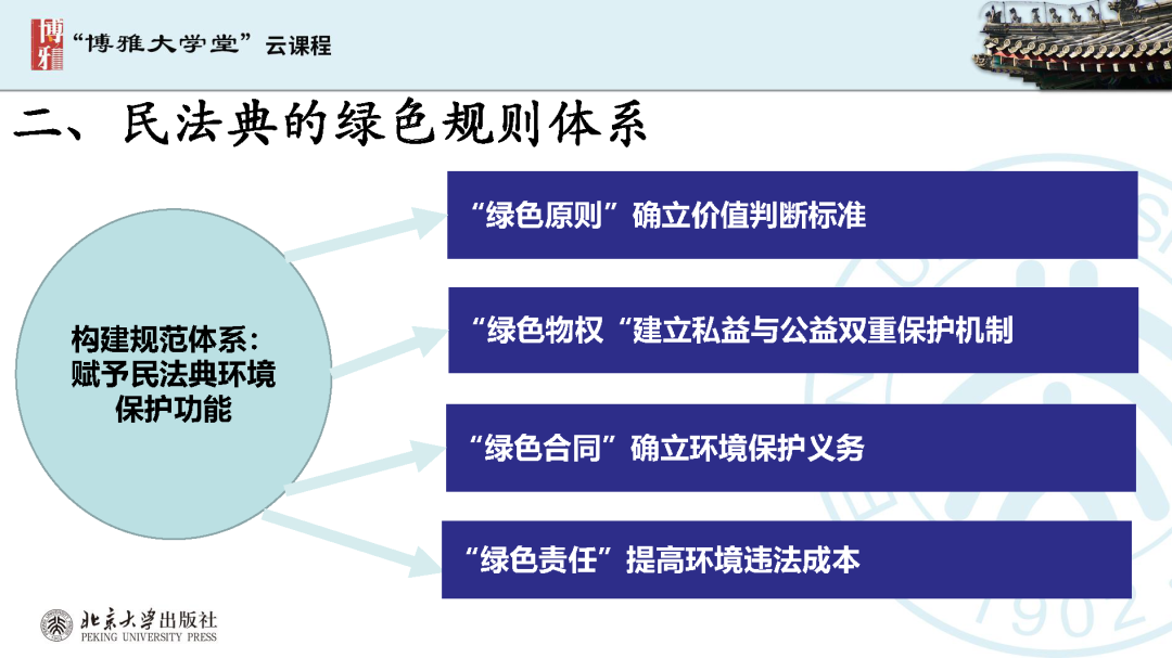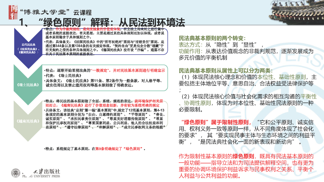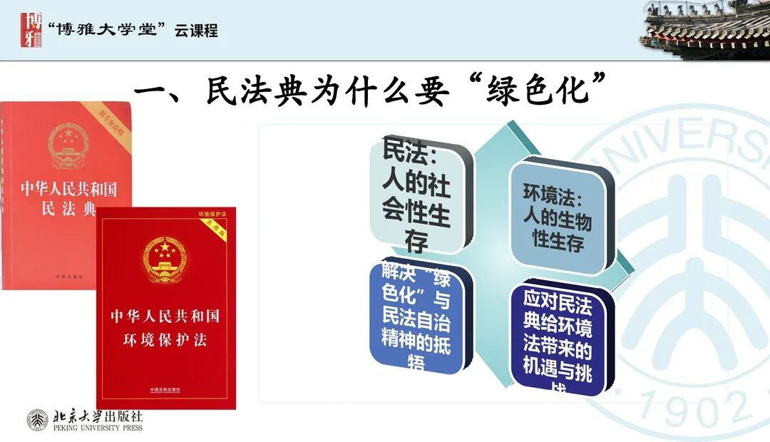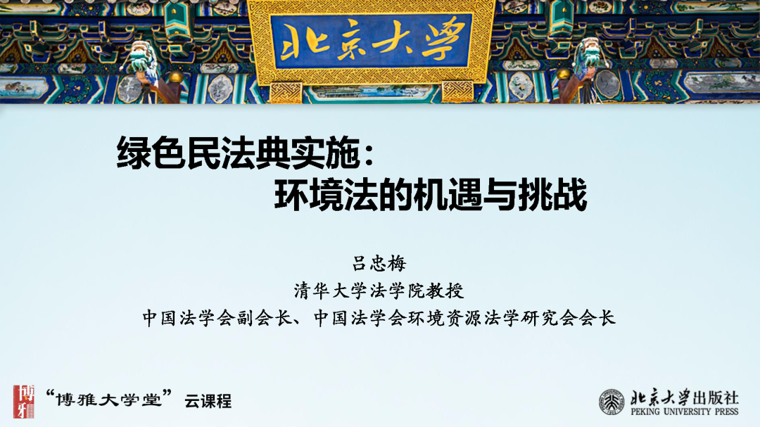 本文為?呂忠梅?老師在博雅大學(xué)堂上的報(bào)告。題目為《綠色民法典實(shí)施:環(huán)境法的機(jī)遇與挑戰(zhàn)》。內(nèi)容主要涉及民法典為什么要綠色化、民法典的綠色規(guī)則體系及綠色民法典給環(huán)境法帶來(lái)的新機(jī)遇和新挑戰(zhàn)。