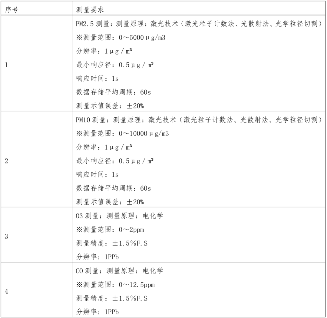 該項(xiàng)目需環(huán)境空氣網(wǎng)格化監(jiān)測(cè)系統(tǒng),集成 PM2.5、PM10、O3、CO、SO2、NO2、TVOC、濕度、溫度、風(fēng)速、風(fēng)向在線(xiàn)監(jiān)測(cè)儀、數(shù)據(jù)采集等技術(shù)為一體的智能監(jiān)測(cè)終端,主要用于環(huán)境空氣質(zhì)量的在線(xiàn)實(shí)時(shí)自動(dòng)監(jiān)控。執(zhí)行標(biāo)準(zhǔn)為生態(tài)環(huán)境部技術(shù)指南、GB3095-2012、GB/T6167、GB/T35273-2017《地面氣象觀測(cè)規(guī)范》。