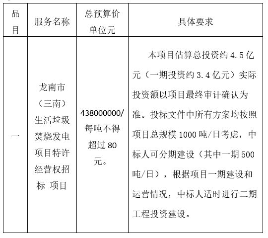 從江西省政府采購(gòu)網(wǎng)獲悉,9月4日,江西省龍南市(三南)生活垃圾焚燒發(fā)電項(xiàng)目特許經(jīng)營(yíng)權(quán)項(xiàng)目發(fā)布招標(biāo)公告,項(xiàng)目預(yù)算金額4.38億元。