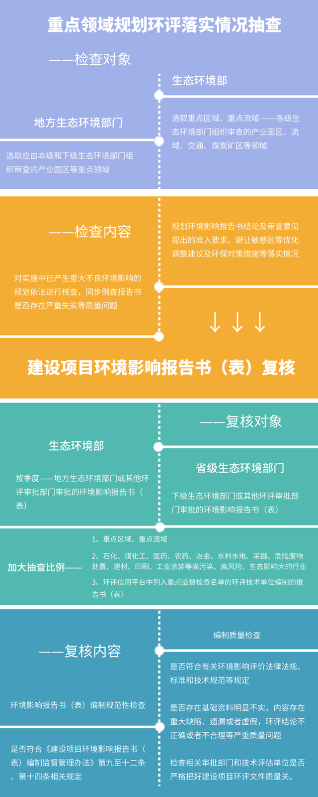 重點領(lǐng)域規(guī)劃環(huán)評落實情況抽查、建設(shè)項目環(huán)境影響報告書(表)復(fù)核、建設(shè)項目環(huán)評文件及批復(fù)要求落實情況抽查、固定污染源排污許可證核發(fā)情況抽查、固定污染源排污許可證執(zhí)行情況抽查