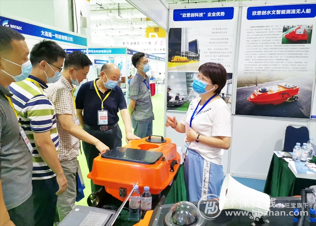 圖為展會期間,欣思創(chuàng)相關參展工作人員為專業(yè)人士介紹水文智能測流無人船