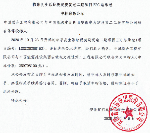 近日,11月5日,安徽省阜陽市臨泉縣生活垃圾焚燒發(fā)電二期項目設(shè)計施工總承包中標結(jié)果公布,中國聯(lián)合工程有限公司與中國能源建設(shè)集團安徽電力建設(shè)第二工程有限公司聯(lián)合體中標該項目,中標金額為25979.8萬元。