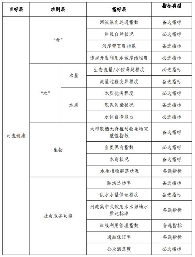 《指南》從生態(tài)系統(tǒng)結構完整性、生態(tài)系統(tǒng)抗擾動彈性、社會服務功能可持續(xù)性三個方面建立河湖健康評價指標體系與評價方法,從“盆”、“水”、生物、社會服務功能等4個準則層對河湖健康狀態(tài)進行評價。
