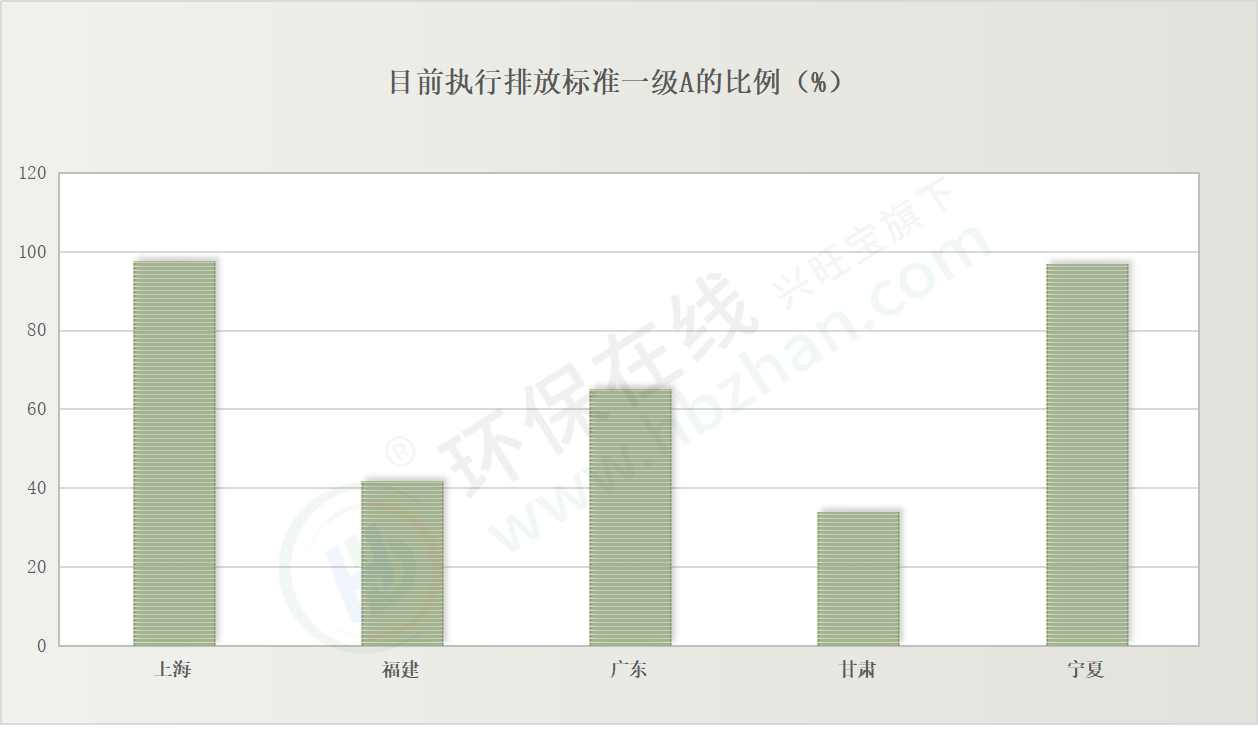 上海、福建、廣東、甘肅、寧夏被納入清單的污水集中處理設(shè)施目前執(zhí)行排放標(biāo)準(zhǔn)一級A的比例: