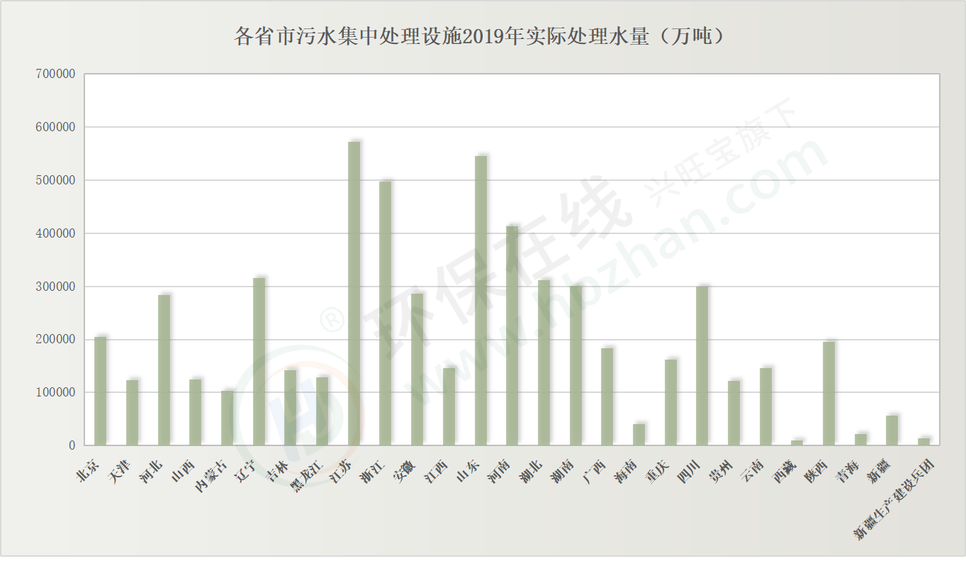 2019年,江蘇實(shí)際處理水量572525.321萬噸,位列榜首,緊隨其后的山東,實(shí)際處理水量為544791.14萬噸。
