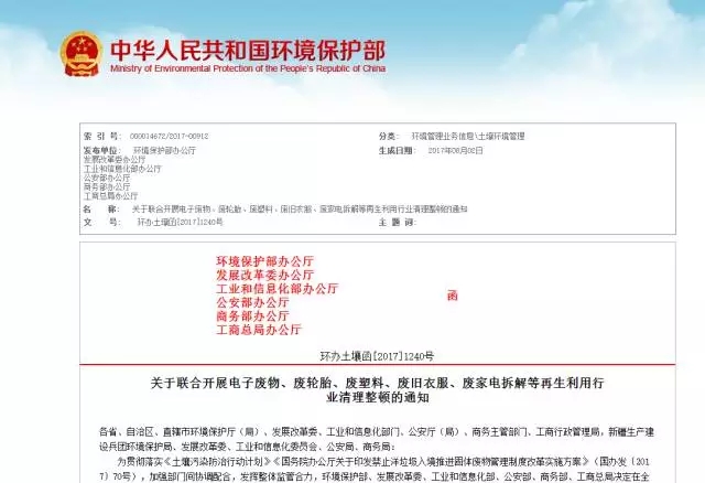 為貫徹落實(shí)《土壤污染防治行動(dòng)計(jì)劃》《國(guó)務(wù)院辦公廳關(guān)于印發(fā)禁止洋垃圾入境推進(jìn)固體廢物管理制度改革實(shí)施方案》(國(guó)辦發(fā)〔2017〕70號(hào)),環(huán)境保護(hù)部聯(lián)合發(fā)展改革委、工業(yè)和信息化部、公安部、商務(wù)部、工商總局開展電子廢物、廢輪胎、廢塑料、廢舊衣服、廢家電拆解等再生利用行業(yè)清理整頓。