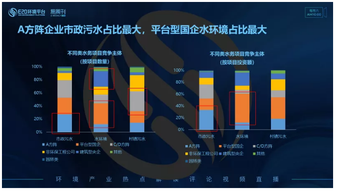 平臺型國企則在市政污水、水環(huán)境、村鎮(zhèn)污水項目均占據(jù)一定的市場份額,并且在水環(huán)境領(lǐng)域優(yōu)勢相對更明顯,項目數(shù)量及投資額占比均最大;另外,對比分析平臺型國企中標的各類項目數(shù)量及所占市場份額發(fā)現(xiàn),水環(huán)境項目、村鎮(zhèn)污水項目所占市場份額明顯高于項目數(shù)量占比,說明平臺型國企獲得的單體投資額大的項目較多。
