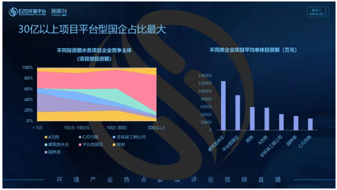 左圖,分析不同投資額區(qū)間水務(wù)項目中標企業(yè)類型發(fā)現(xiàn),2020年前三季度,水務(wù)A方陣企業(yè)在小于30億項目中,隨著金額增加占比變化不明顯,當項目投資額大于30億,占比明顯減小;C/D方陣企業(yè)則隨著項目投資額增加,占比不斷減小,在<1億的項目中,占比最大,由此說明C/D方陣更傾向投資額相對較小的項目;平臺型國企在各個投資額區(qū)間均占了較大的市場份額,在30億以上項目中,占比最大,近70%。