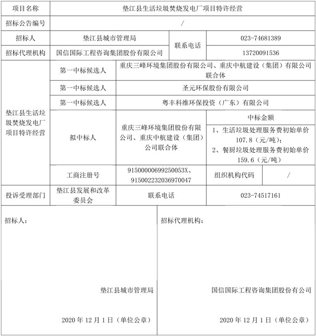 日前,墊江縣生活垃圾焚燒發(fā)電廠項(xiàng)目特許經(jīng)營(yíng)中標(biāo)候選人公示,重慶三峰環(huán)境集團(tuán)股份有限公司、重慶中航建設(shè)(集團(tuán))有限公司聯(lián)合體為該項(xiàng)目第一中標(biāo)候選人,中標(biāo)金額為生活垃圾處理服務(wù)費(fèi)初始單價(jià)107.8元/噸、餐廚垃圾處理服務(wù)費(fèi)初始單價(jià)159.6元/噸。